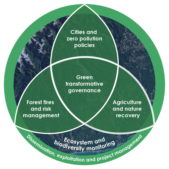 GreenEO is structured around four key land-use areas, each representing a domain where improved environmental monitoring can drive more sustainable practices. These are linked by a central focus on transformative governance and supported by communication and coordination efforts.
